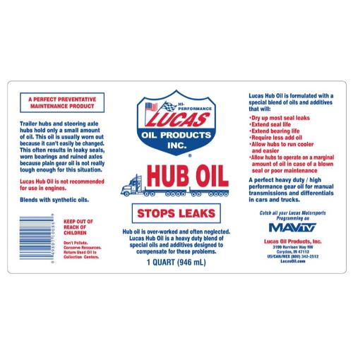 Product Details: Lucas Hub Oil was formulated to stop leaks in steering axles and trailer hubs on heavy duty trucks. It also allows hubs to run on a marginal amount of oil in case of a blown seal or poor maintenance. It is an excellent gear lube for racing or heavy duty applications.