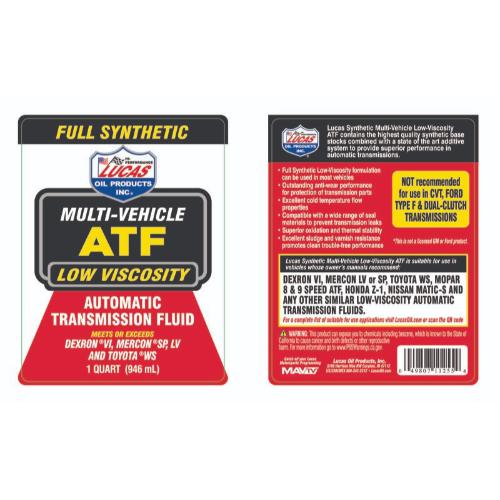 Product Details: Lucas Oil Low Viscosity Multi-Vehicle ATF is blended from premium API Group III synthetic base oils, combined with shear-stable viscosity modifiers and a high-quality additive package that includes anti-wear, anti-oxidants and corrosion inhibitors.
