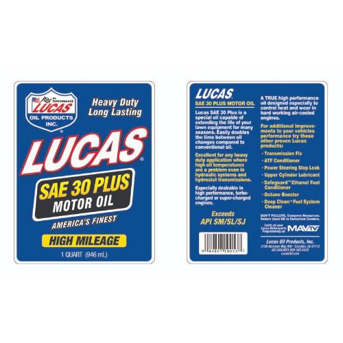 Product Details: Lucas 30 WT Plus is a blend of high quality base stocks and an exclusive additive package that sets it far apart from other 30 WT oils. Lucas 30 WT Plus is designed to lower oil temperature and slow oil consumption. Lucas 30 WT extends the life of engines in race cars, lawn equipment, farm equipment or any other situation where a superior 30 WT oil is needed.