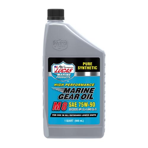 Product Details: Lucas M8 Synthetic SAE 75W-90 Marine Gear Oil is a pure synthetic, non foaming, super slick, long lasting lubricant designed especially for marine applications. Originally designed for high powered off shore racing boats, M8 Marine Gear Oil contains seal conditioners and an exclusive blend of synthetic additives that protect from rust and wear caused by both fresh water and salt water during long periods of storage.
