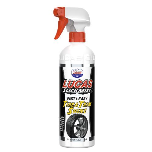 Product Details: Lucas Slick Mist Tire & Trim Shine is a treatment spray designed to give Tires and Trim a long lasting “like-new” shine. Use Slick Mist Tire Shine to remove dull, grey oxidation from Bumpers, Tires, Plastic, or any Rubber and Vinyl Trim.
